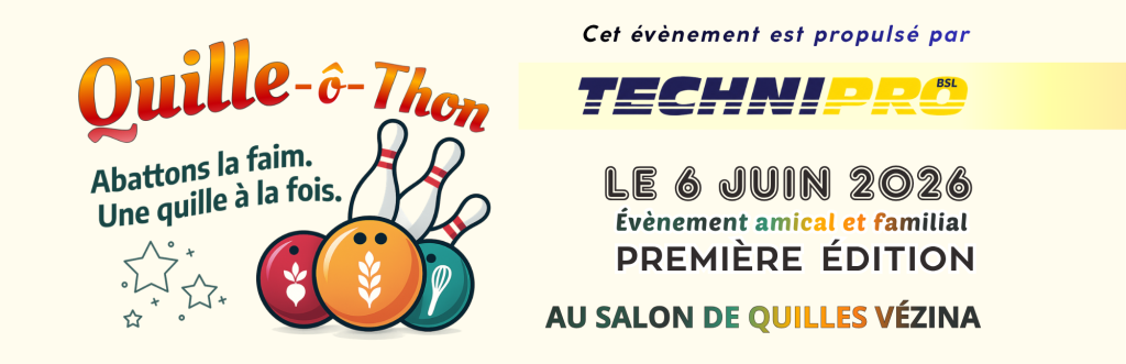 Les fonds recueillis alimenteront directement les dépannages alimentaires, les cuisines collectives et les services offerts gratuitement aux personnes dans le besoin. Ensemble, abattons la faim, une quille à la fois !
